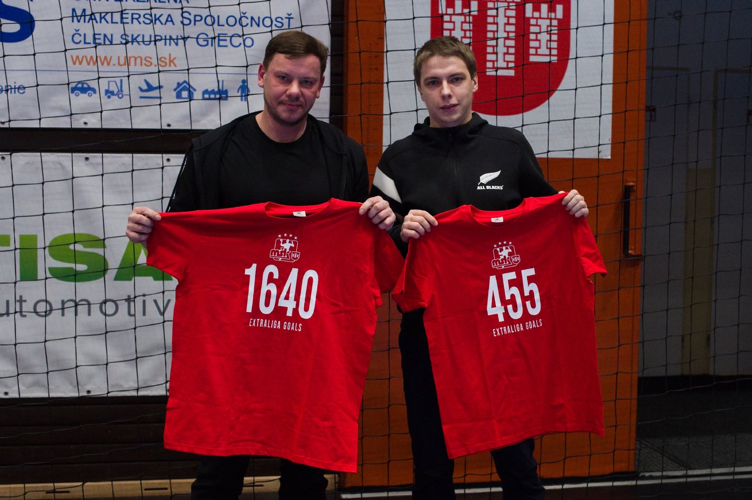Tomáš Vallo (vľavo) a Marián Gardian s pamätnými dresmi MŠK. Čísla na ich prednej strane im budú pripomínať počet extraligových gólov, ktoré počas dlhoročnej kariéry strelili.